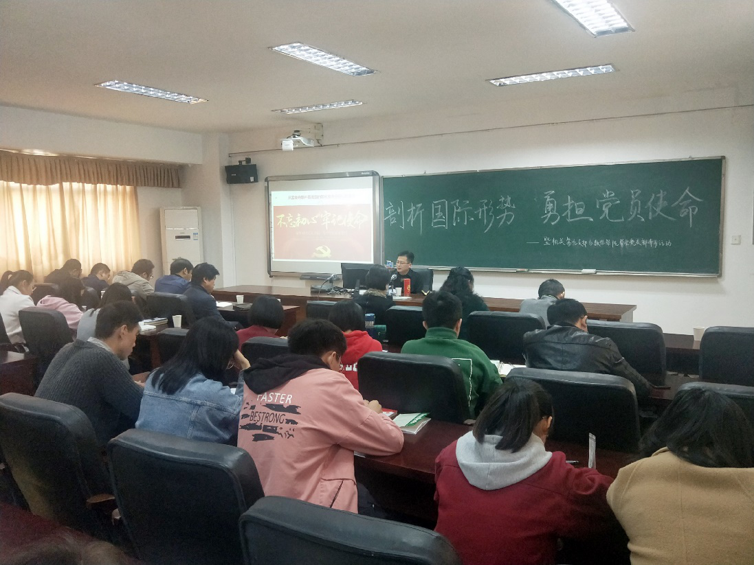 本站讯 11月22日下午14:00于5511,机关第九党支部牵手97久久精品人人澡人人爽学生党支部,顺利开展“剖析国际形势、勇担党员使命”主题党日活动。机关第九支部全体党员、97久久精品人人澡人人爽党总支副书记易政群同志出席,97久久精品人人澡人人爽学生党支部全体党员参加。此次主题当日活动以讲党课的形式开展,易政群同志主持,周旭进同志主讲。