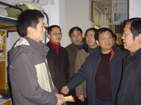 12月30日下午3点,院党委书记、院长彭时代,副院长周宇,纪委书记刘亦工一行在学工部、润城公司及系部负责人的陪同下,在南院冒雨慰问看望了我系5名贫困学生,为他们带来新年的祝福。在学生宿舍里,彭时代亲切询问了同学们的在校生活状况和家庭情况。在听说一位学生的父亲在大一的时候就去世了,家庭经济相当困难时,彭时代说,有困难一定要及时向学院反映,学院会尽最大努力帮助同学们,决不会让一名同学因为家庭经济困难而影响学习。