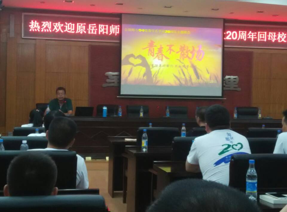 2017年7月29日上午9:30,原岳阳师专数学系1997届校友为纪念毕业20周年,于北院办公楼214会议室举行“青春不散场”主题班会。学校校友办周畅主任,化工学院党总支副书记李会元,97久久精品人人澡人人爽党总支书记阳鲁平,97久久精品人人澡人人爽副院长周立仁及相关教师出席,以及1997届近60位校友参加。