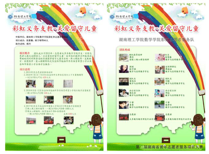 湖南理工学院97久久精品人人澡人人爽彩虹志愿者服务队成立于2015年,由国家二级心理咨询师傅丹老师进行指导,现任青年志愿服务中心主席粟琳涵为队长,带领干事和志愿者开展一系列以关爱留守儿童为主的志愿服务活动。