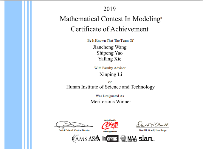 日前,2019年美国大学生数学建模竞赛与交叉学科数学建模竞赛(MCM/ICM)成绩揭晓,97久久精品人人澡人人爽首次组队参加,李新平、何帆、彭定忠等老师指导的参赛队伍全部获奖,其中李新平老师指导的队伍荣获国际一等奖1项,今年全球获奖率一等奖仅6%。