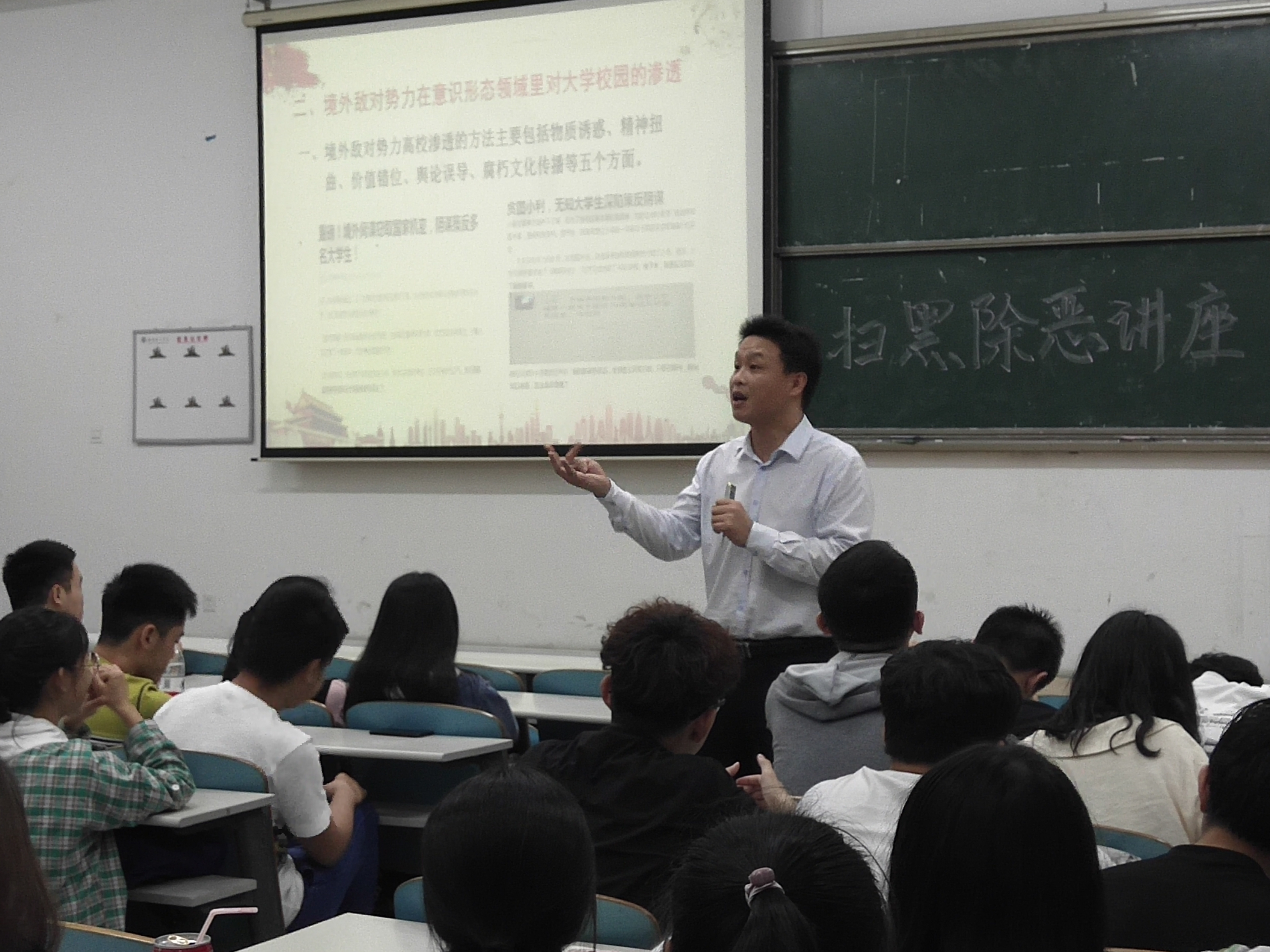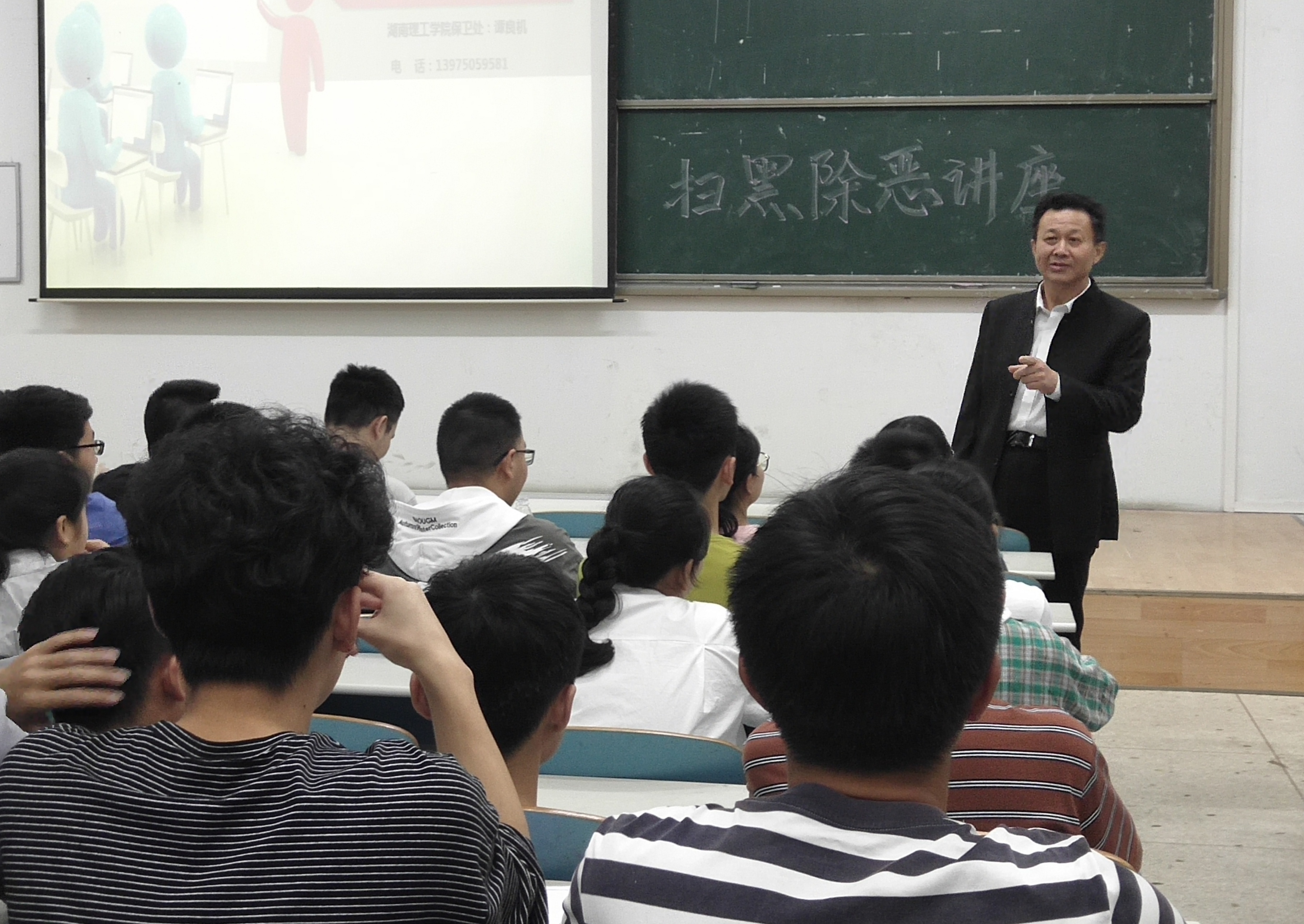 本站讯 本周二晚七点,97久久精品人人澡人人爽17、18级部分同学于9T1教室参加了反黑除暴安全教育讲座,此次讲座的主讲人为湖南理工学院保卫处谭良机处长,97久久精品人人澡人人爽党总支副书记易政群老师出席了本次讲座。
