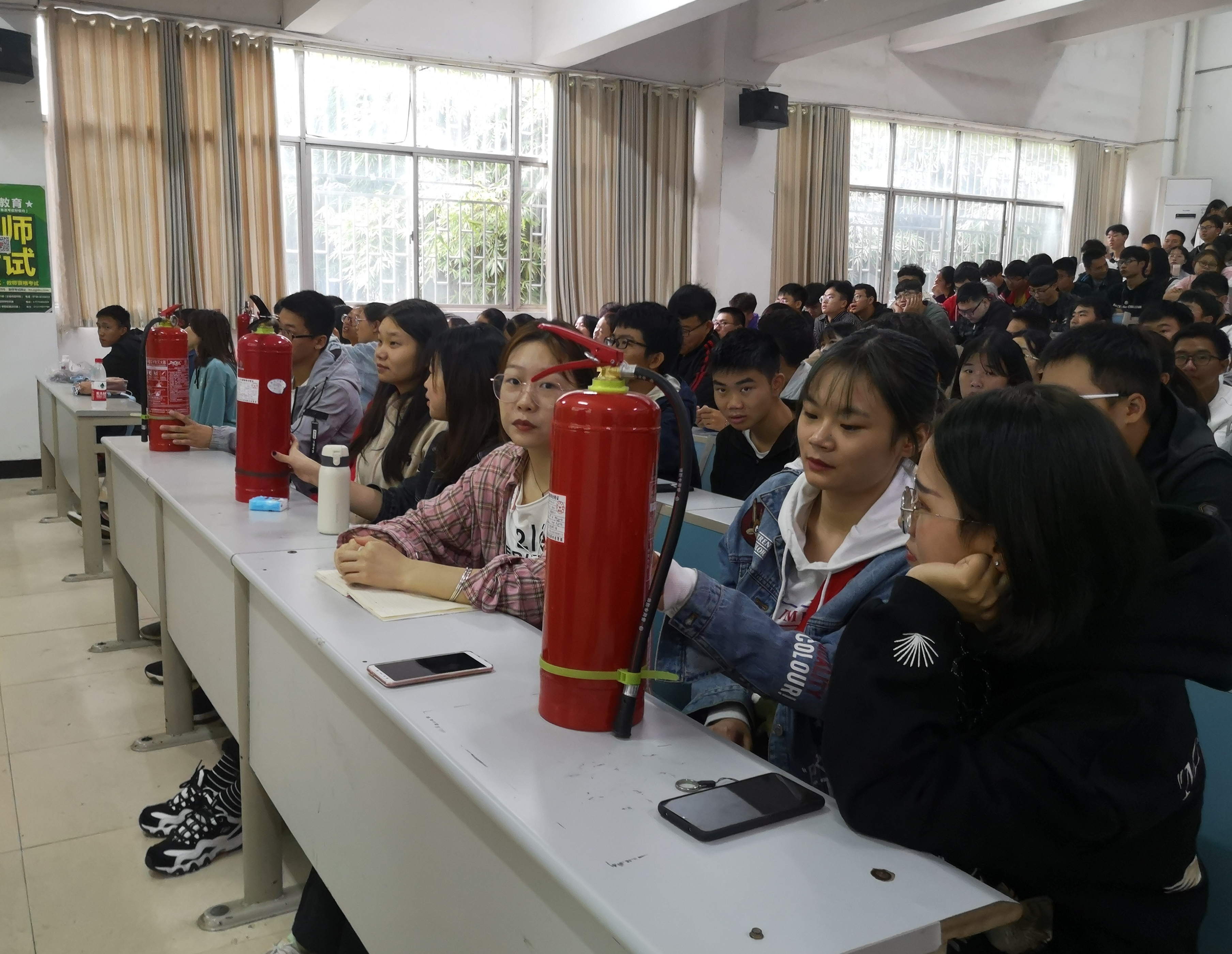 接着梅傲寒同学描述了灭火器的使用方法,并让同学们对灭火器进行了传看,通过近距离接触让大家能够大致了解灭火器的构造,学会简单的操作。