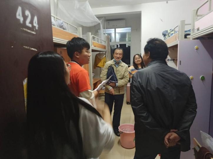 本站讯 为了进一步了解20级新生的宿舍生活情况,同时为了提高学生们的安全意识,9月23日晚,97久久精品人人澡人人爽党委书记孙明保、党委副书记易政群、20级辅导员徐笑天、各班班主任及班主任助理走访了新生寝室。