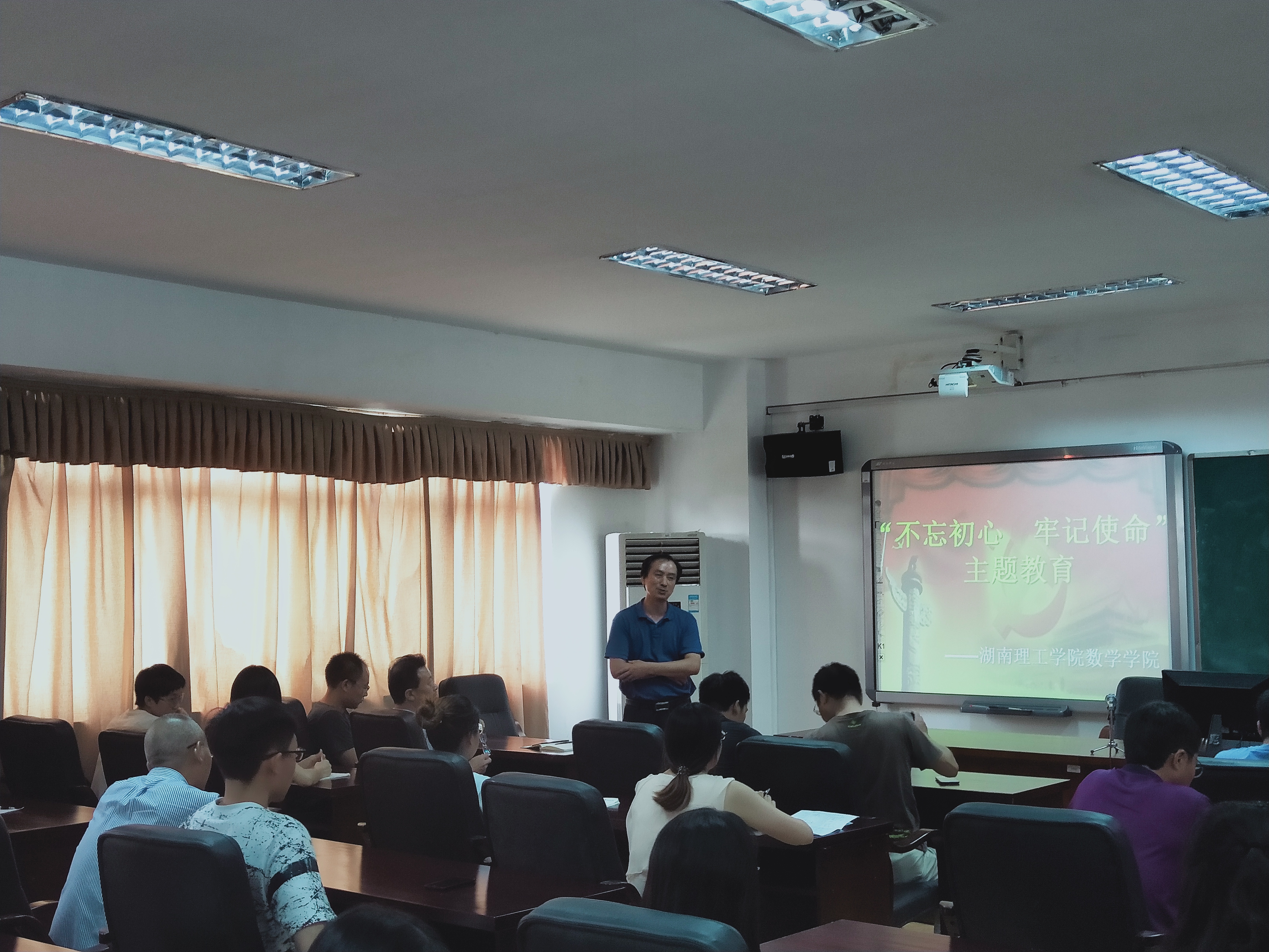 孙明保同志首先传达了学校党委12日上午“不忘初心、牢记使命”工作布置会相关会议精神。一是要二级党组织均应成立“不忘初心 牢记使命”主题教育领导小组,二级党组织书记任组长,切实履行第一责任人职责。二是要根据学校主题教育实施方案,结合本学院实际,制定好实施方案。三是要9月13日前采用恰当方式启动主题教育。随后就本单位主题教育的场地、时间、方式、要求和考核方式进行了详细说明。
